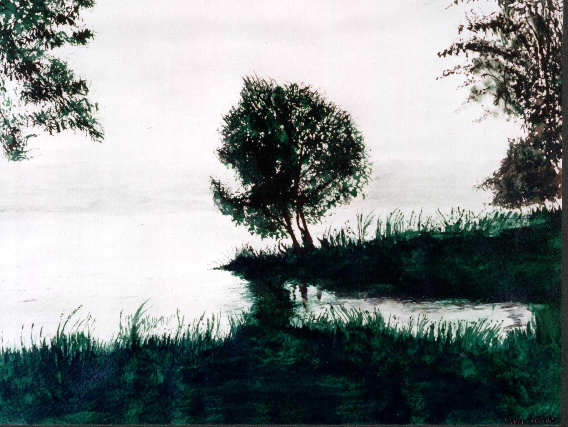 Der Tag geht zur Neige , die Stille der Nacht kehrt zurück. Diesen Zustand versuchte der Künstler in seinem Aquarell fest zu halten. Eine Erfahrung, welche er oft nach einem langen Angeltag in der Natur erleben durfte.