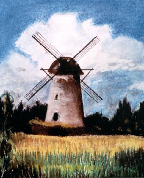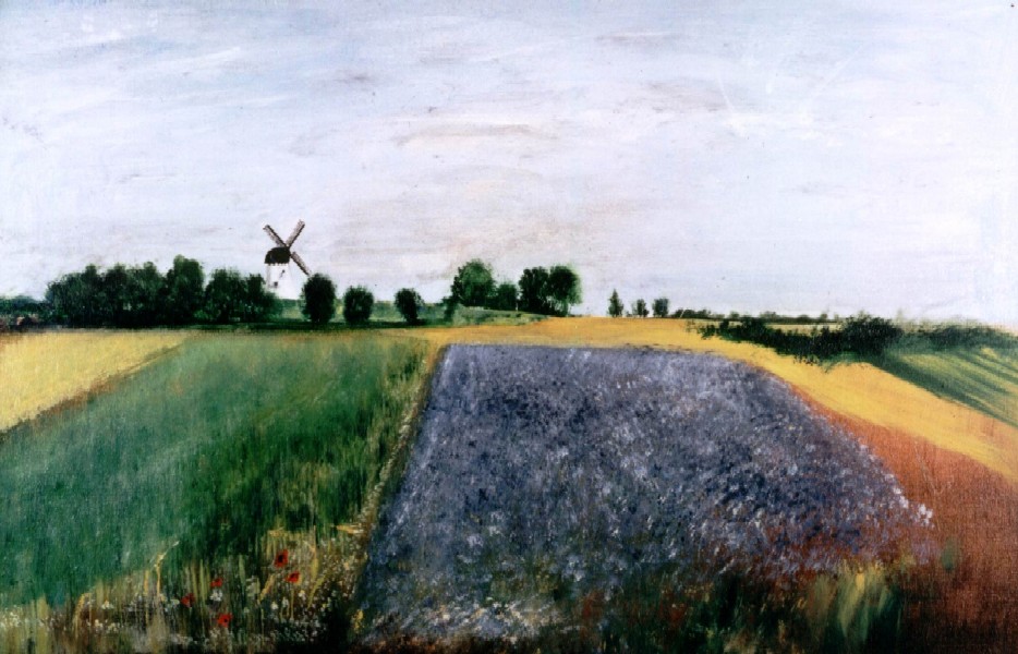 Für Einheimische ist der Egelsberg bekannt als Segelflugplatz. Doch auch die Natur hat hier etwas für den mußesuchenden Wanderer zu bieten. Die vorletzte Eiszeit hat hier die Erde aufgestaucht und diesen sanften Erdhügels entstehen lassen. Auf dem höchsten Punkt der hügeligen Landschaft ragt die Egelsberger Mühle hervor. Das Bild wurde vom Künstler vor Ort gemalt.