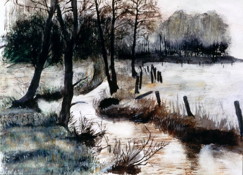 Ein Bach schlägelt sich behäbig durch die winterliche Landschaft. Blaugraue , teils herbstzeitliche Töne beherrschen das Bild.