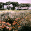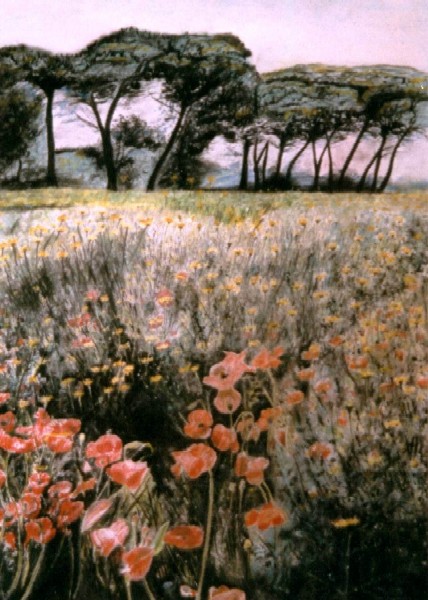 In weichen Tönen fließen die Farben auf einer blühenden Wiese dahin. Beim näheren Hinschauen erkennen wir Mohnblumen. Die Blumenwiese scheint endlos zu sein. Doch im Hintergrund erkennt das geschulte Auge einen Kiefernwald in leicht bläulichem Licht getaucht.