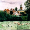 Auf diesem Bild weiden Schafe. Im Hintergrund befindet sich ein Idylisches Dorf. Der Maler setzte für die Erstellung des Bildes die Aquarelltechnik ein.
